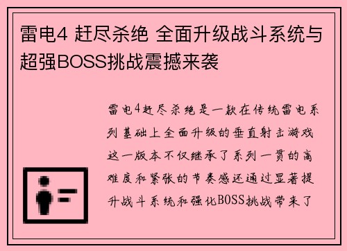 《雷电4:赶尽杀绝》是一款在传统雷电系列基础上全面升级的垂直射击游戏。这一版本不仅继承了系列一贯的高难度和紧张的节奏感,还通过显著提升战斗系统和强化BOSS挑战,带来了全新的游戏体验。本文将从四个方面详细探讨《雷电4:赶尽杀绝》如何通过战斗系统的全面升级、BOSS设计的创新、游戏画面的提升以及音效和...
